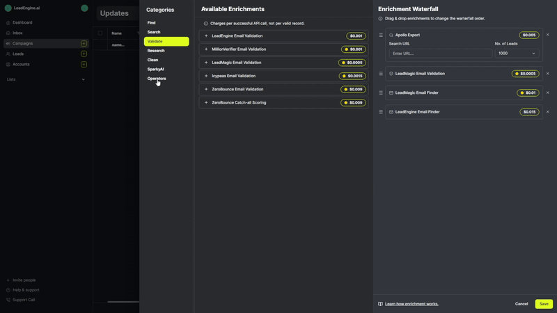 The “Add to Campaign” Operator in EnrichEngine allows you to enroll leads automatically into an EmailEngine campaign, saving you time by automating a previously manual task. When combined with the other Operator filters, you can ensure only the best leads make it into your email campaigns!